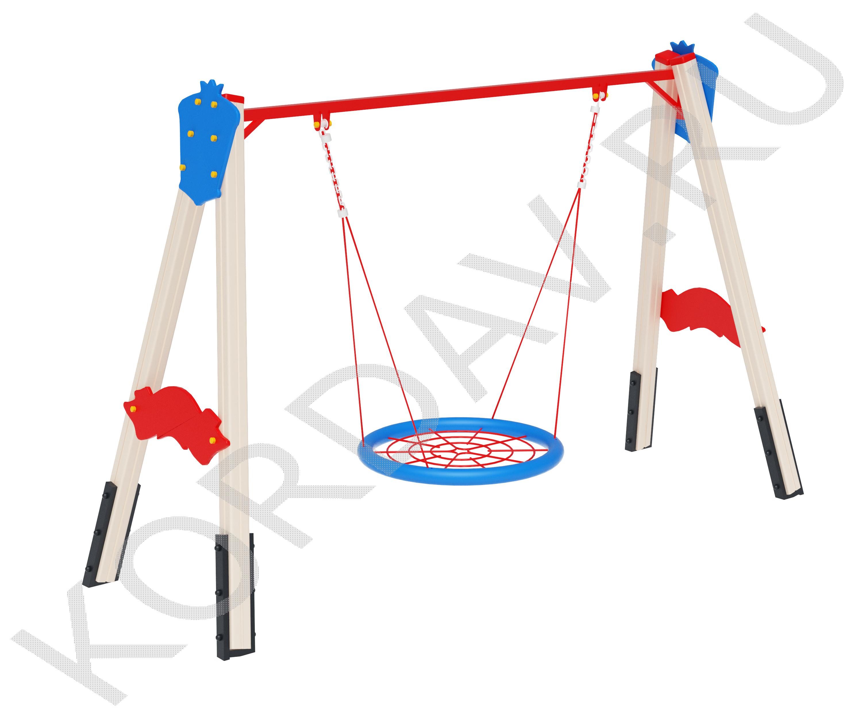 Сиденье «Гнездо»Диаметр сиденья — 1000 мм. Плетение внутри кольца выполнено из четырёхпрядного армированного каната диаметром 16 мм. Качели комплектуются подвесами из шестипрядного армированного каната. Длина подвесов — 1340 мм. Подвес из цепи. Цепь: короткозвеньевая, не калиброванного класса, прочность металла Т(8), диаметр сечения звена цепи 6 мм. Цепи соединены в единый подвес наконечником для крепления к перекладине качели. Наконечник выполнен из втулки с подшипниками и скобы.